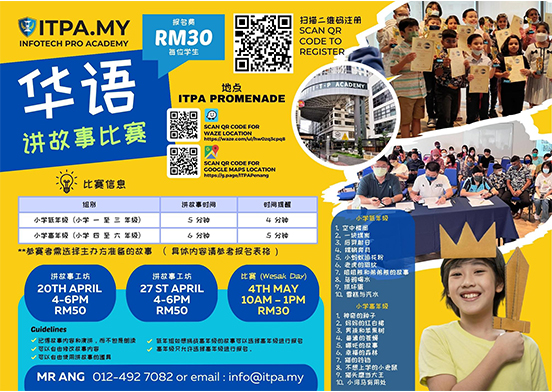 This Chinese Story Telling contest is organized by Infotech Pro Academy ( ITPA ) Penang. This contest serves as a platform for all students to excel on stage. It is not a formal contest and the main purpose of the contest is to provide good stage experience and let students learn to speak in front of crowd with confidence.